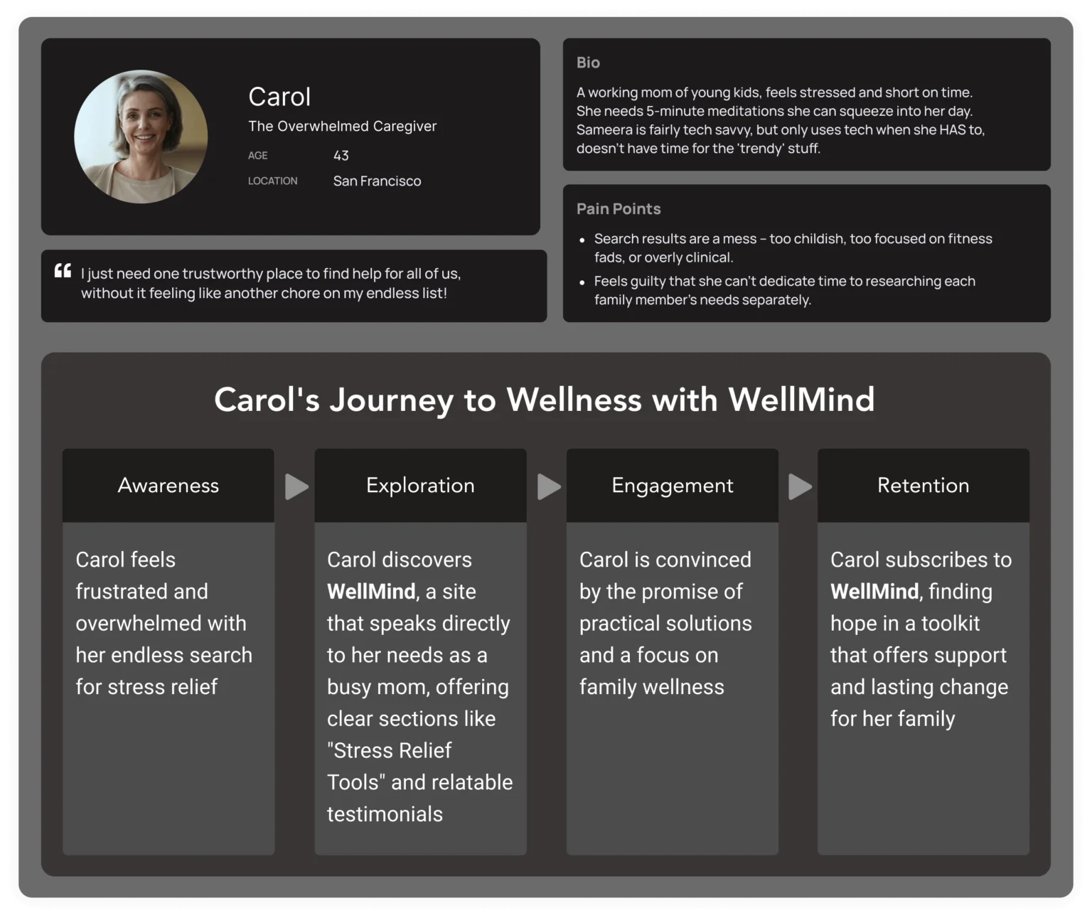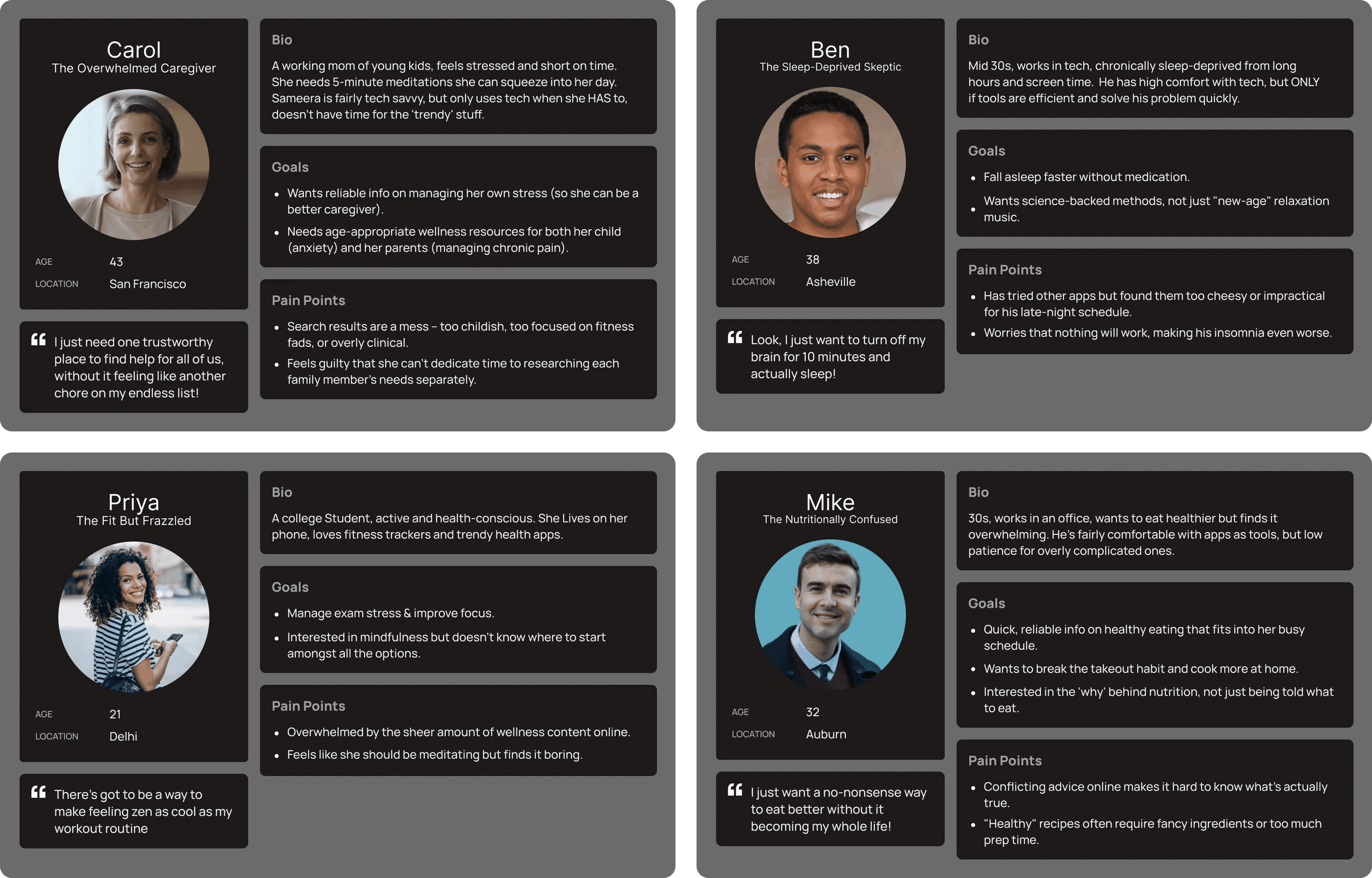 Personas were crafted to reflect real stress patterns, lifestyle pressure, and energy levels. They shaped tone, navigation depth, and the role of simplicity in decision making.