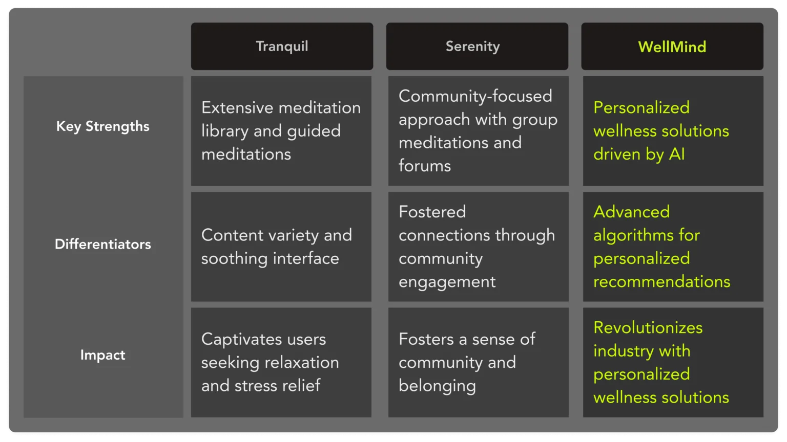 Competitors like Tranquil focused on deep content libraries, while Serenity focused on social wellness.